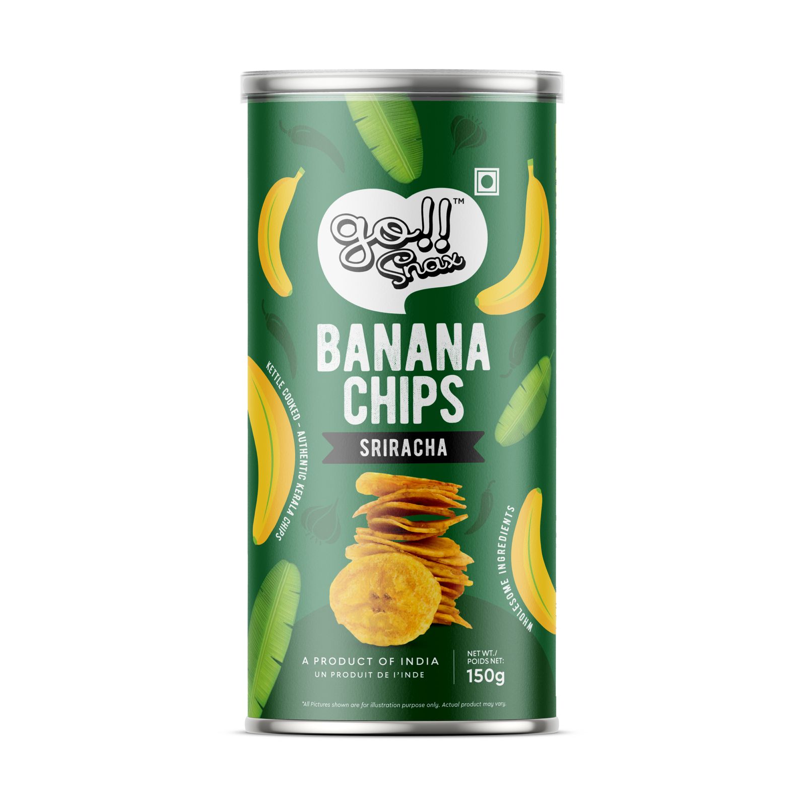 Ingredients: Banana, Palmolein, Sriracha Seasoning(Sugar, iodized salt, spices and condiments (chilli, pepper, ginger), dehydrated powders (garlic, onion), dextrose, maize starch, maltodextrin, tomato powder, hydrolyzed vegetable fat, natural and nature identical flavoring substances, yeast extract, acidity regulator (INS 330), flavor enhancers (INS 627, INS 631), thickener (INS 412), anticaking agent (INS 551) and antioxidant (INS 319))